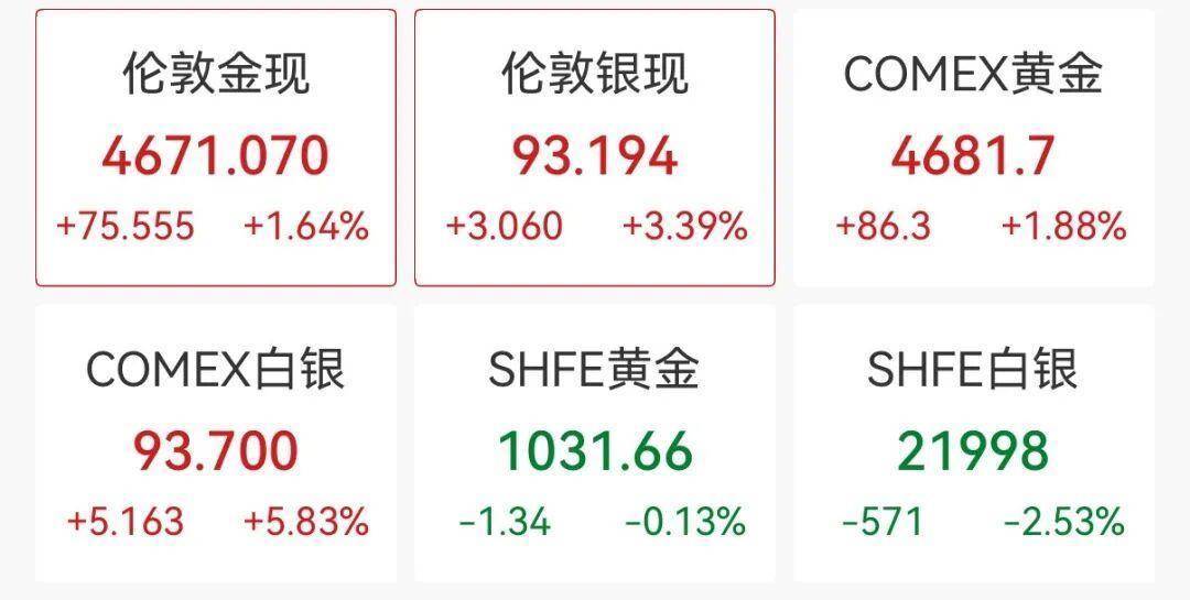 抑止发稿,伦敦金现涨1.64%报4671.07好意思元/盎司,伦敦银现涨3.39%报93.194好意思元/盎司;COMEX黄金涨1.88%报4681.7好意思元/盎司,COMEX白银涨5.83%报93.7好意思元/盎司。