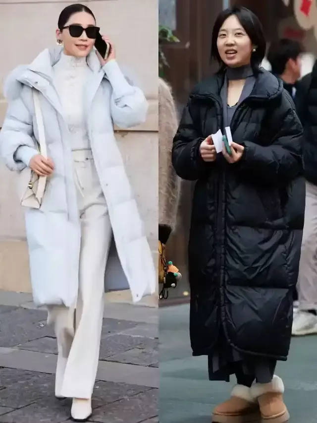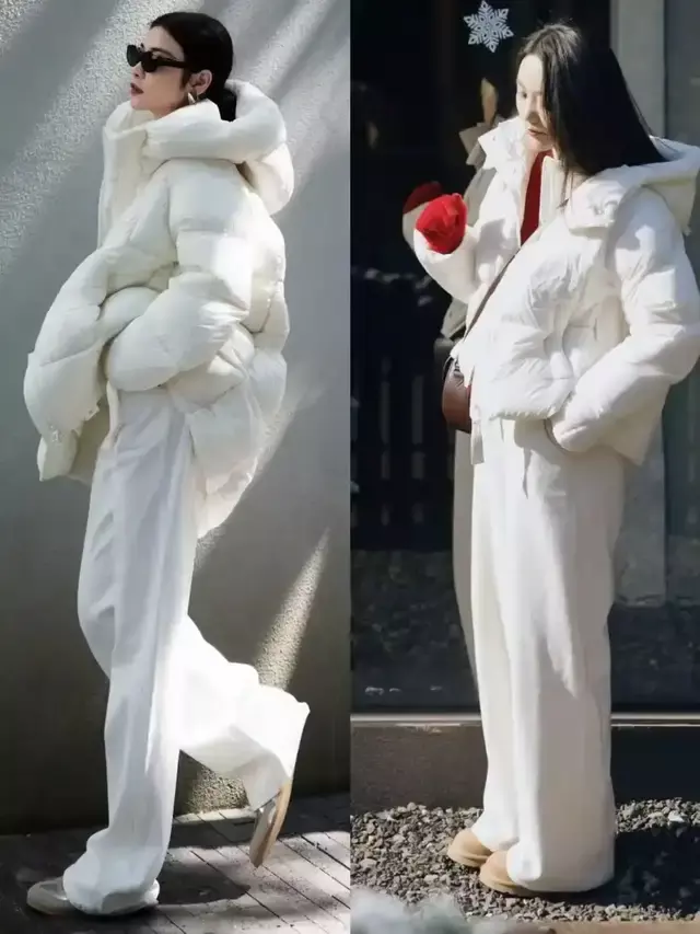羽绒服本人就有一种蓬松的视觉恶果,这时代还要选择像上头图片中右边这一件玄色的廓形羽绒服,穿在身上之后就像乌龟壳一样,显得很重荷。