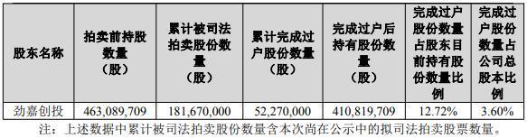劲嘉创投累计被功令拍卖股份数目为181,670,000股,累计完成过户股份数目为52,270,000股。