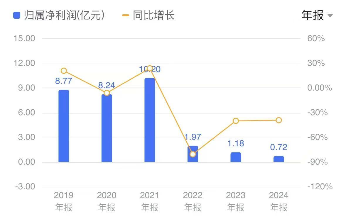 2022年至2024年,劲嘉股份营业收入差异为51.89亿元、39.45亿元和28.57亿元,同比差异增长2.40%、-23.96%和-27.58% ,已辩论两年下滑;净利润差异为1.97亿元、1.18亿元和7198.52万元,同比差异增长-80.64%、-40.03%和-39.19%,已辩论三年下滑。