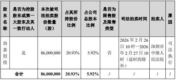 公告表示,劲嘉创投本次被功令拍卖股份数目为86,000,000股,占其所捏股份比例为20.93%,占公司总股本比例为5.92%。功令拍卖时辰为2026年2月26日10时—2026年2月27日10时。