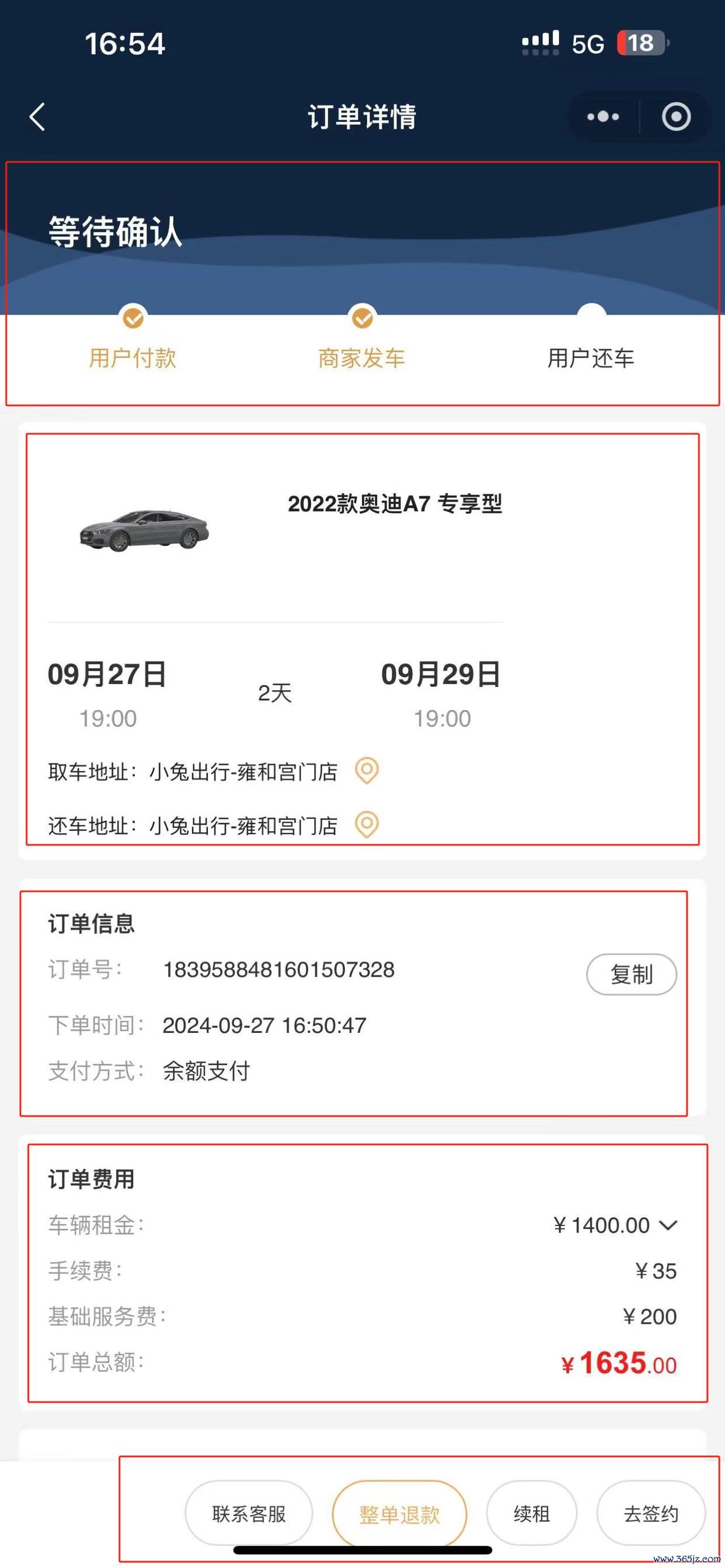 可稽查订单现时的状态(用户付款、商家发车、用户换车)
