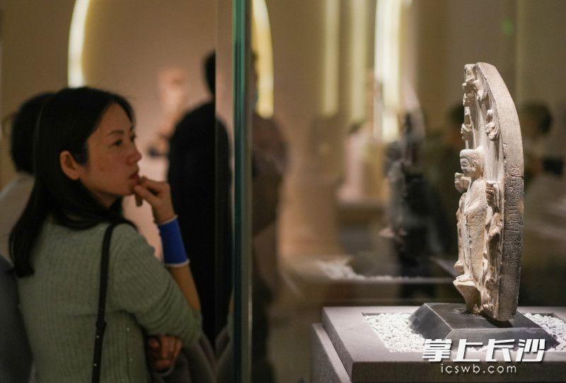 展出的67件文物中,多件珍品初次离开皆鲁地面亮相湖南。如曾流失国际、如今“沉沦归来”的蝉冠菩萨像,以其金蝉栖冠、璎珞披身的私有造型,成为端淑归来的记号。此外,贴金彩绘佛立像、彩绘想惟菩萨像等作品,以其低落的眼眸、微扬的唇角,展现出内敛而谦让的好意思学气质。即使部分造像略有破败,还是以其静谧的浅笑传递出超越时空的体恤与力量。